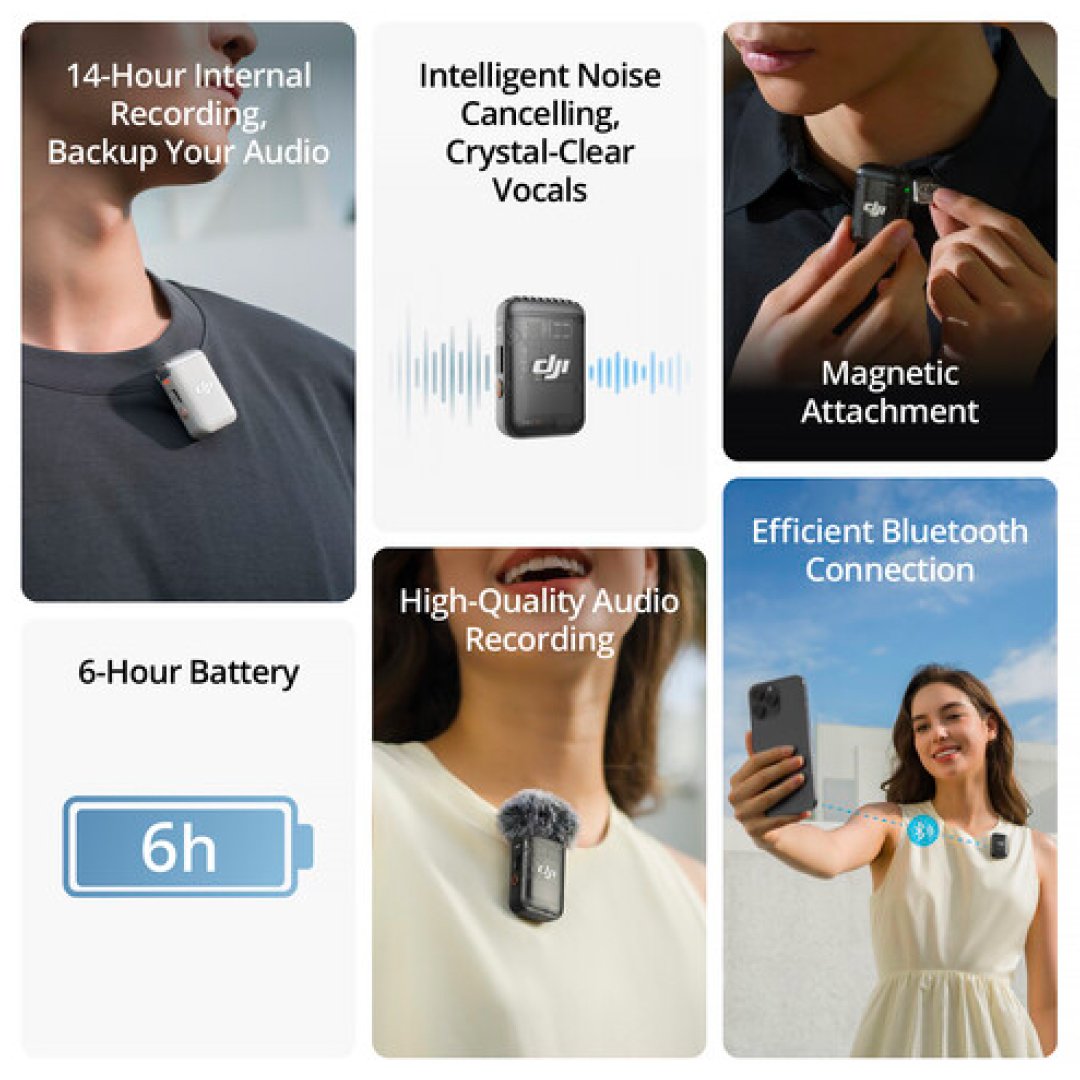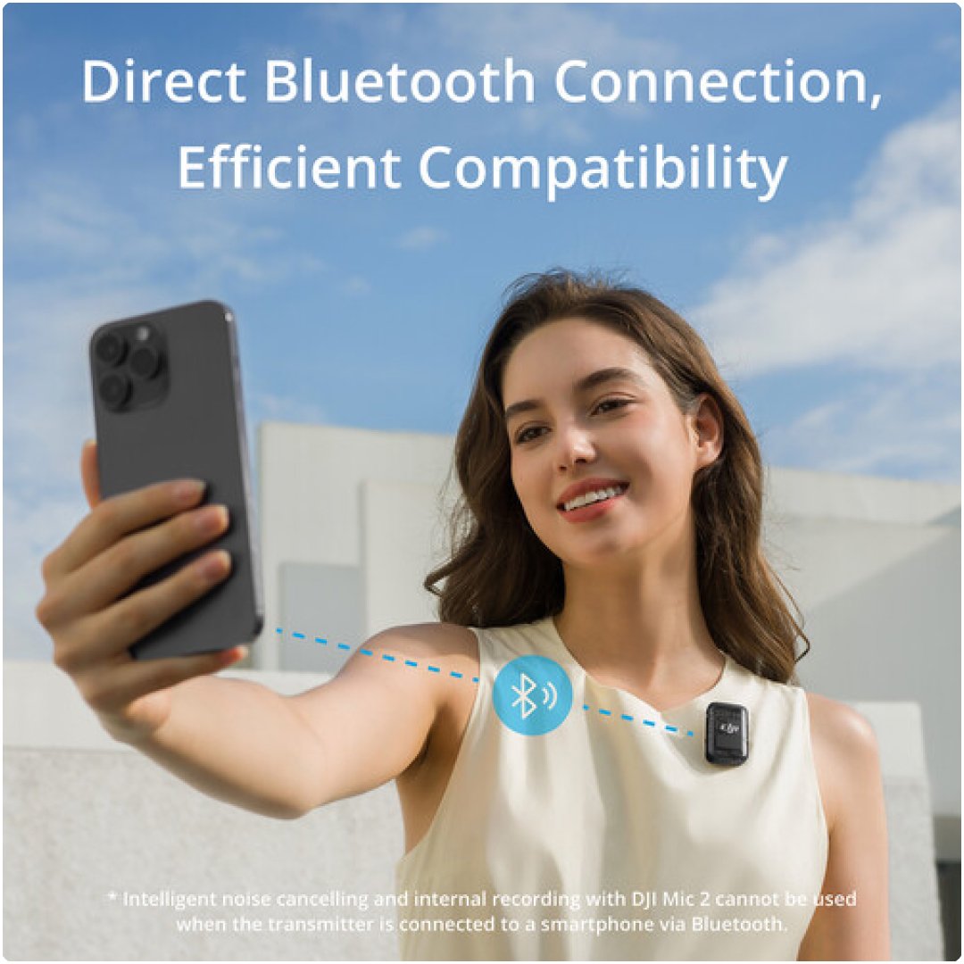 The transmitter also supports direct Bluetooth connection to smartphones and compatible DJI devices, enabling flexible workflows without requiring a receiver in certain scenarios. With onboard storage, intelligent noise cancellation, and reliable wireless transmission, the DJI Mic 2 transmitter is a powerful, ultra-portable audio solution.