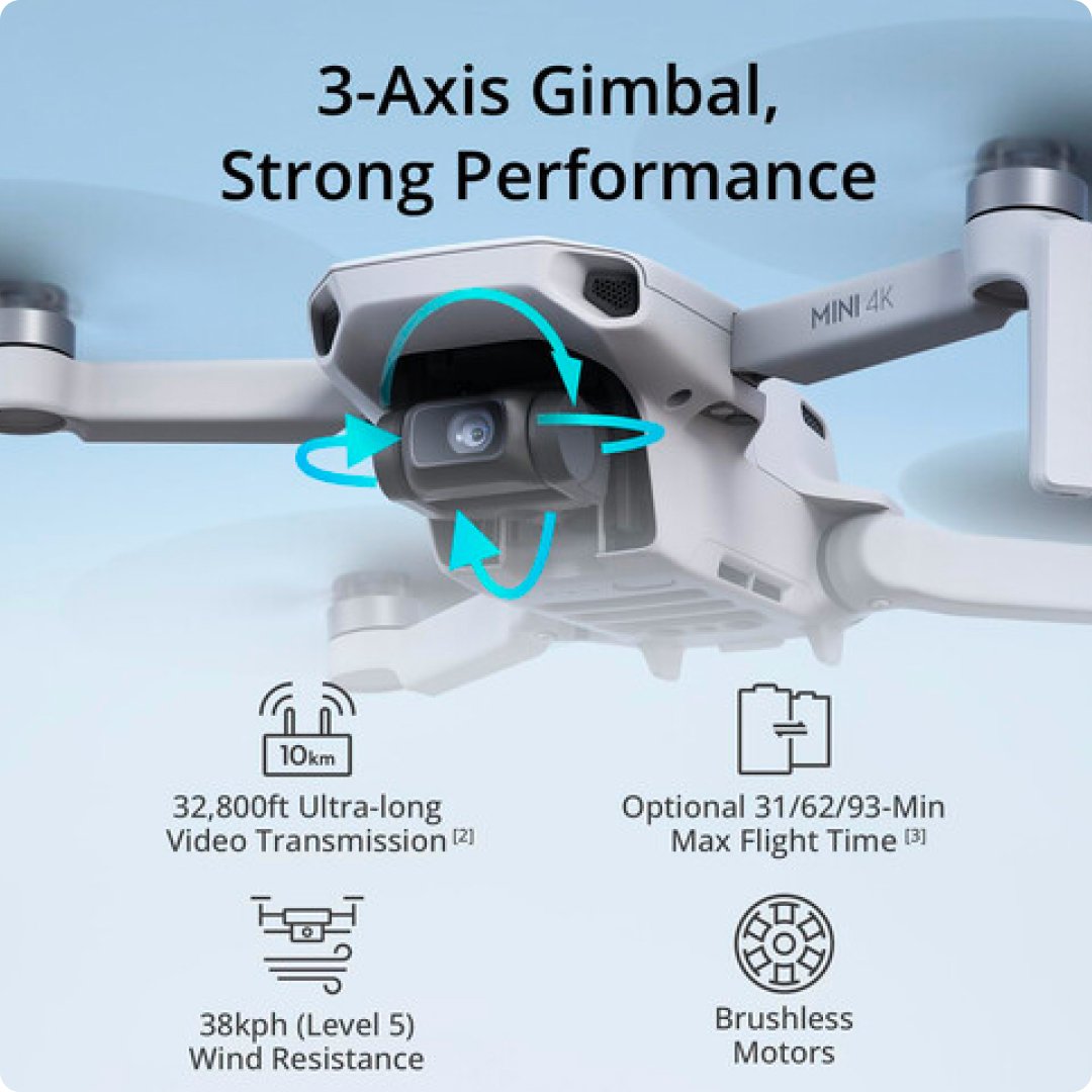 The DJI Mini 4K Drone is a compact and lightweight aerial camera platform designed for photographers, videographers, and everyday creators who want cinematic 4K footage without the complexity of larger drones. Weighing under approximately 249 g, it fits into many countries’ lighter drone categories, making it easier to fly with minimal regulatory requirements. Despite its small size, it offers high‑resolution 4K video, stable flight performance, and intelligent shooting modes that help you capture stunning aerial content with ease.