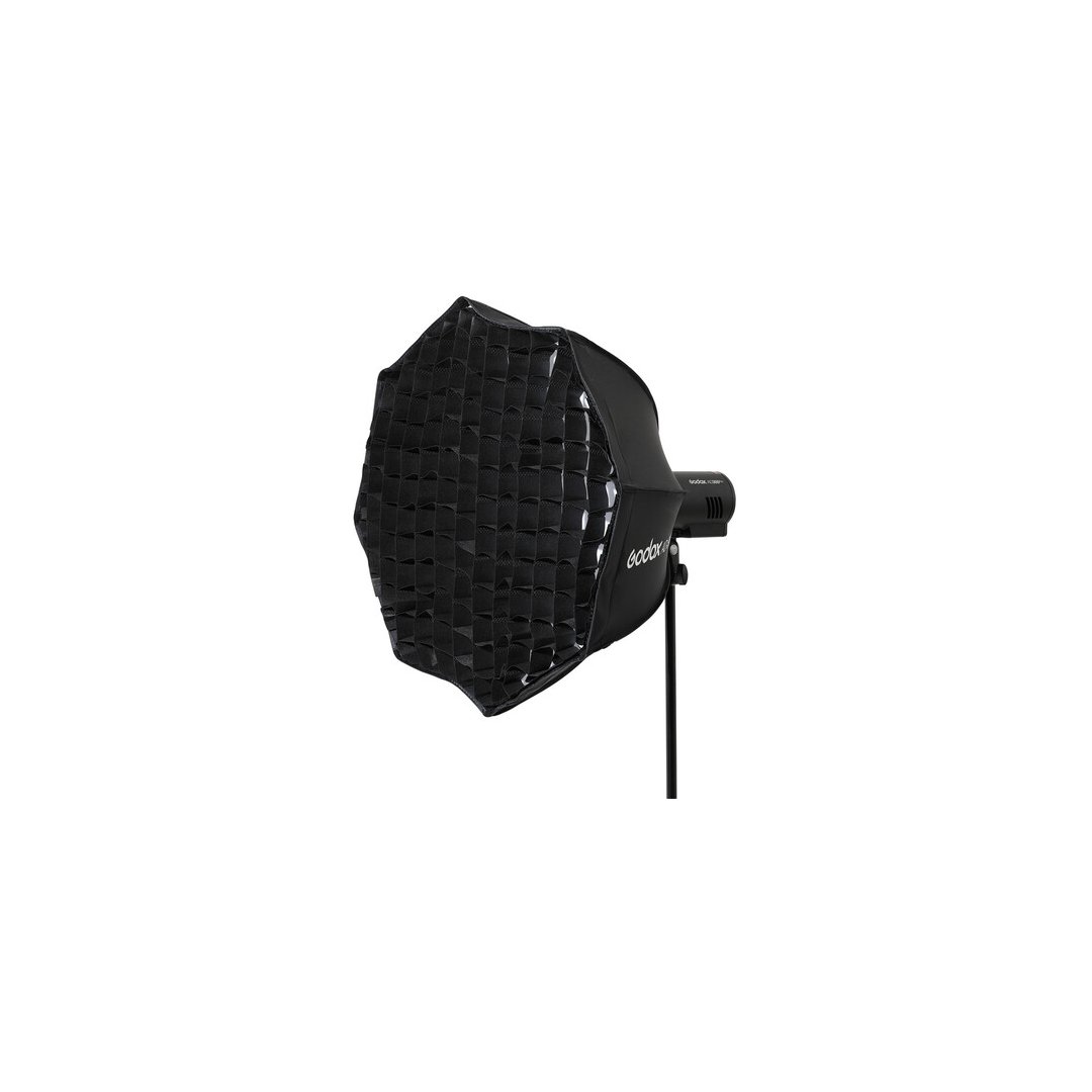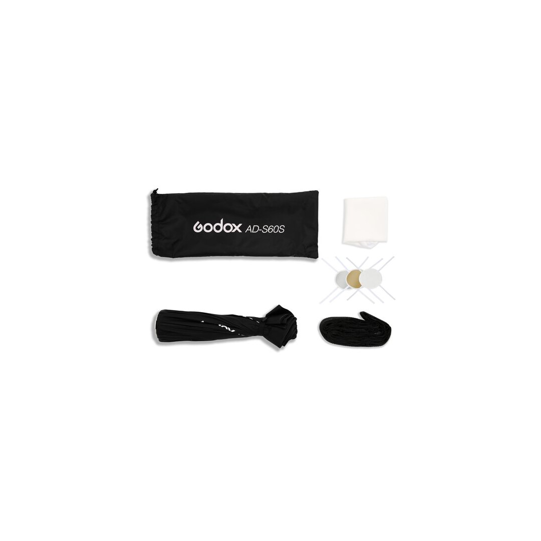 Built with a quick‑open mechanism, the AD‑S60S sets up and breaks down quickly, making it convenient for fast-paced shooting environments. It attaches via Godox Mount, so it can be mounted directly on compatible Godox lights like the Godox AD300Pro, AD400Pro, and ML60 series without additional adapters. Included accessories such as a grid and diffusers offer control over spill and light softness.